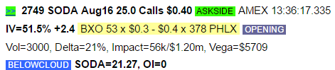Breakeven: Where is the breakeven point in this setup? These options are just out of the money and are being bought for $0.40. At that strike price that would make this traders upside breakeven $25.40, or about 19.4% higher than the stock’s price at the time of the trade. This is a large move to the upside, but is not an unreasonable move for a stock like SODA considering the amount of time left until expiry and the earnings catalyst that this expiration captures. With that in mind the setup becomes even more attractive.