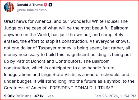 Meanwhile, Trump hailed the decision, calling it “Great news for America, and our wonderful White House!” The president also updated that the construction is ahead of schedule and under budget.